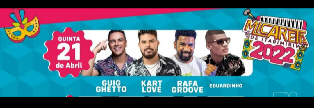 A estreia da Micareta de Itagimirim para o folião itagimiriense acontece hoje dia 21 de abril (quinta-feira), para agitar o feriado de Tiradentes, com os shows de Guig Ghetto, Kartlove, Rafagroove e Eduardinho durante a festa que marca o encontro dos artistas com o público da cidade. No palco, as bandas apresentam os maiores sucessos de suas carreiras.