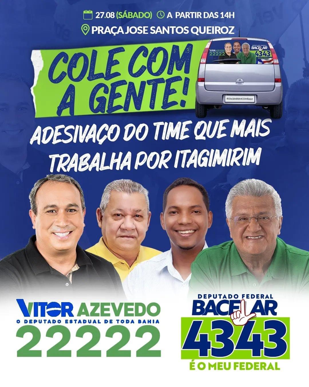 O prefeito Luizinho (Podemos) mobiliza a população para o adesivaço de campanha na tarde deste sábado, 27, em apoio aos candidatos João Carlos Bacelar (PV) à reeleição a deputado federal e Vitor Azevedo a deputado estadual. O encontro promete reunir um expressivo número de carros e motos de aliados e apoiadores, bem como vereadores, lideranças e militantes políticos para percorrer as ruas da cidade em apoio ao Time que mais trabalha por Itagimirim.